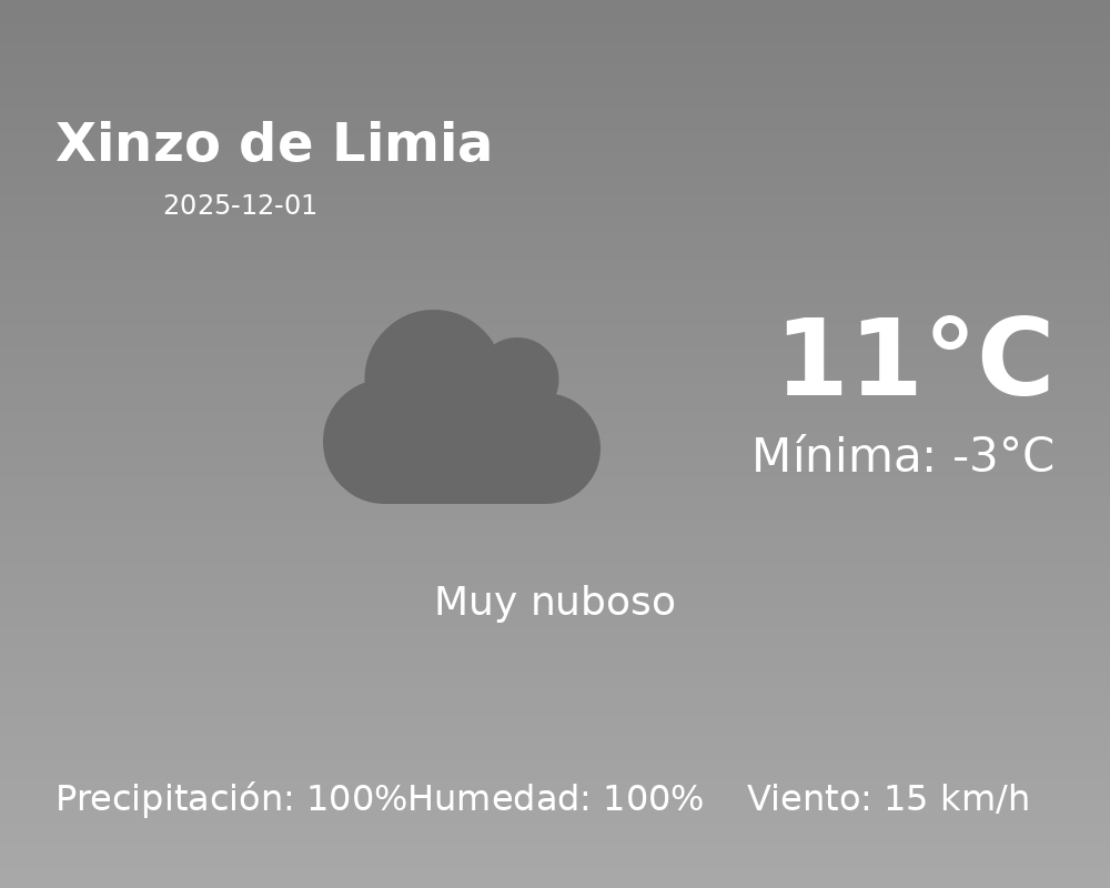 Hoy, en Xinzo de Limia, el paisaje está cubierto por un cielo predominantemente gris, debido a que el estado del cielo es de 15 en la escala utilizada para clasificar la nubosidad. Es importante tomar precauciones ya que se espera un día significativamente húmedo, con un 100% de probabilidades de precipitaciones, lo que indica que es probable que las lluvias sean continuas.