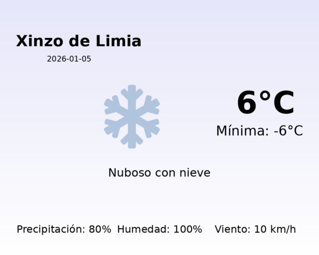 El clima en Xinzo de Limia hoy se presentará con características invernales marcadas. Se anticipa una temperatura máxima de 6°C, mientras que la temperatura mínima caerá a -6°C. Este contraste térmico puede generar condiciones de frío intenso, especialmente durante las horas de la mañana y la noche.