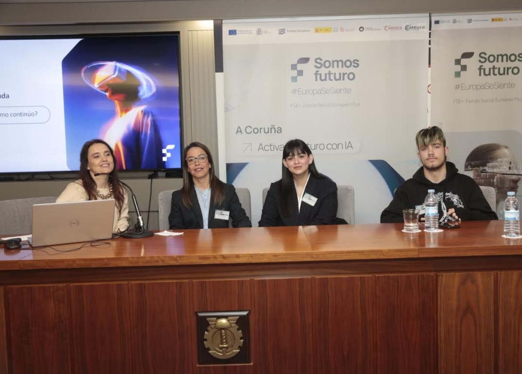 A continuación, se ha celebrado la mesa redonda titulada “¿Y ahora cómo continúo?”, un espacio de diálogo en el que se ha abordado cómo la IA está transformando los perfiles profesionales, qué papel desempeña ya en distintos sectores y qué oportunidades abre para quienes están iniciando su trayectoria laboral. Las expertas también han ofrecido consejos prácticos para afrontar la búsqueda de empleo en un entorno cada vez más digitalizado. Moderada por Raquel Maquieira, la mesa ha contado con la participación de Isabel Rodríguez, orientadora y técnica de formación del programa Talento Joven de la Cámara de Comercio de A Coruña; Ángeles Andrea Lara Chacón, exalumna de Talento Joven del curso de Personal Shopper y actualmente vinculada a un proyecto de emprendimiento; y Leo Vilas Quintela, alumno del curso de Creación y Diseño de Videojuegos 3D del mismo programa.