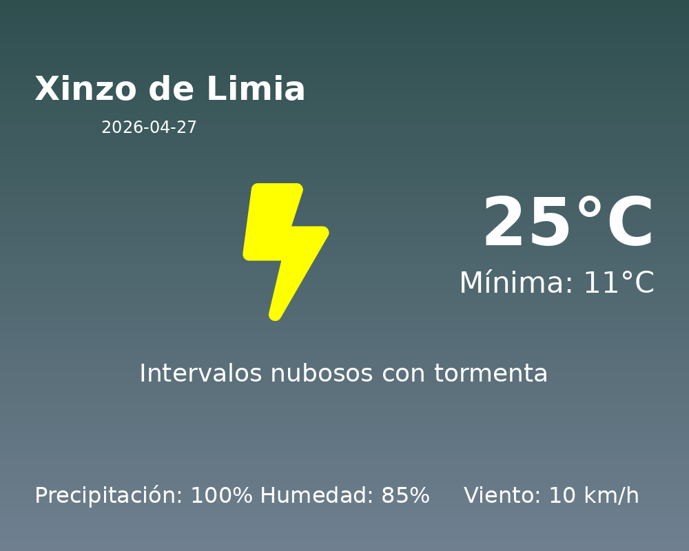 Hoy, 27 de abril de 2026, Xinzo de Limia experimentará condiciones climáticas características de esta época del año, con temperaturas que oscilarán entre una máxima de 25°C y una mínima de 11°C. La amplitud térmica es considerable, indicando una jornada con mañanas y noches frescas, y temperaturas agradables durante el día.